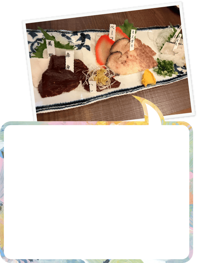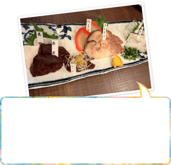 - 50年以上営業する老舗に、仕事終わりに4人で行った時の写真です。おいしい鯨肉やセリ鍋、刺身、日本酒などを楽しみました。声を掛ければ気軽に集まれるのも、GCCの魅力の一つだと感じています。