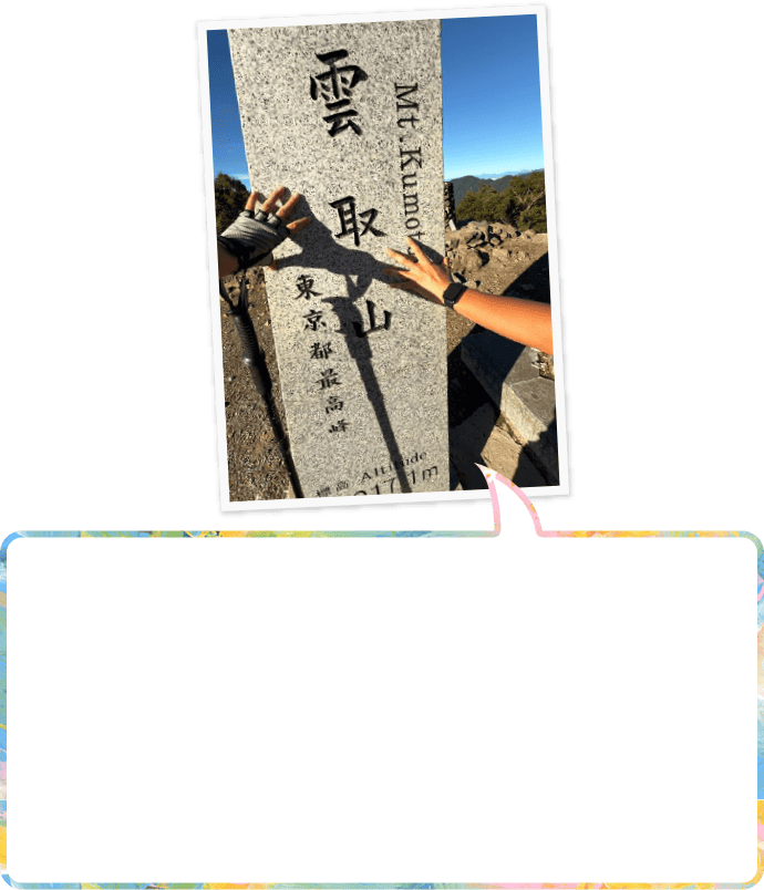 - 会社の後輩と一緒に、奥多摩の雲取山に1泊2日で登りました。後輩とは10歳差ありますが、歳の差を気にせず仲良くしてくれています。2,000m超えという都内で一番高い山だったので、置いて行かれないように必死ではありましたが(笑)、いい思い出になりました。